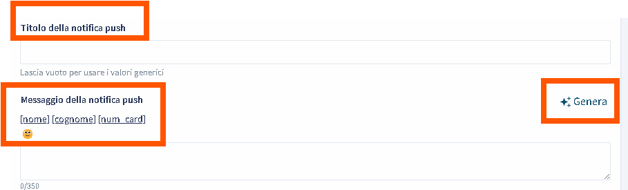 Questa opzione consente di inviare una notifica direttamente sul dispositivo del cliente tramite l'app, non appena il coupon viene assegnato. Si possono personalizzare sia il titolo, sia il contenuto della notifica, utilizzando variabili come nome, cognome e numero card per messaggi dinamici. Il campo messaggio permette di adattare il testo alle specifiche esigenze comunicative. Il sistema offre anche la possibilità di lasciare i campi vuoti per usare valori generici impostati di default.