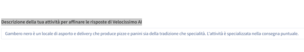 Per cominciare istruisci Velocissimo AI, vai nella sezione Negozi > Selforder > e cerca "Descrizione della tua attività per affinare le risposte di Velocissimo AI"